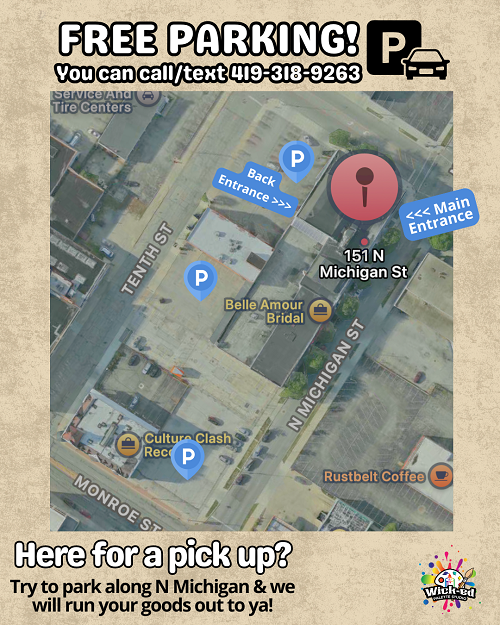 Visiting our location? Please call or text when ya get there and we'll come down to let you into our secured building 419-318-9263. If by chance you make it in the building, we are located on the second floor, take a left off of the elevator and follow the hallway around to suite 227/228.